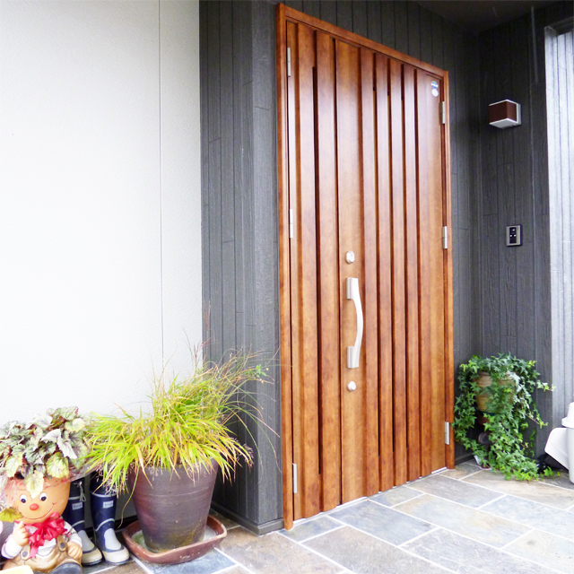 センスの感じられるグリーンたちと調和した玄関扉は重厚感あふれる、和やかなたたずいがステキです